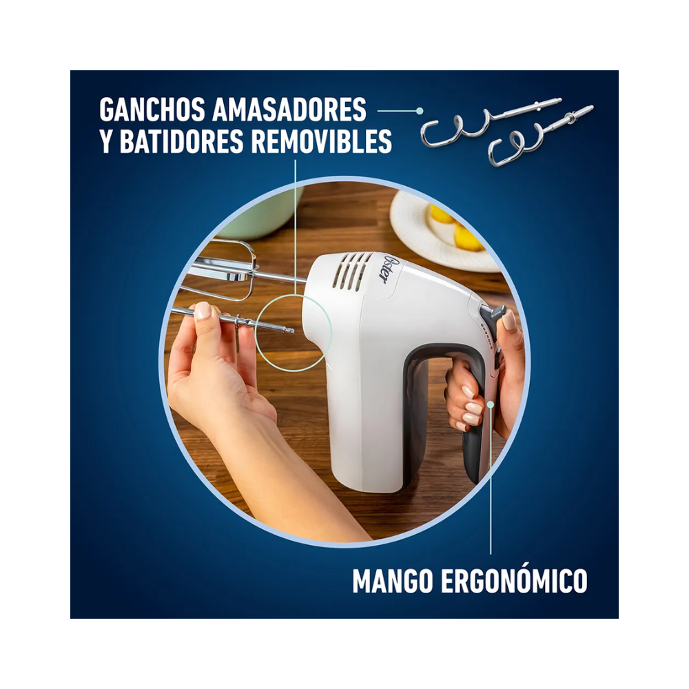 Esta práctica batidora de mano Oster® te permite preparar desde gruesas masas de galletas hasta delicados merengues. El diseño ergonómico de su mango te brinda máxima comodidad para que prepares deliciosas comidas y postres con mayor facilidad. Además, cuenta con 6 velocidades y una función de Turbo que provee potencia adicional al toque de un botón. Ya sea para batir o amasar, esta batidora de mano Oster ® te hará la tarea mucho más fácil.