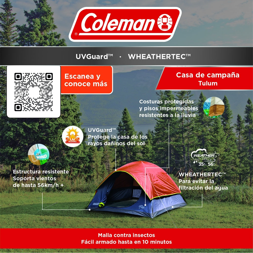 Estructura que protege contra cualquier clima, sistema WHEATHERTEC con esquinas soldadas y costuras invertidas y selladas para evitar la filtración de agua y tecnología UVGuard que ayuda a proteger la casa de los rayos del sol. Cuenta con un bolsillo para almacenar tus dispositivos electrónicos. Es liviana y compacta para aventuras de camping. Incluye bolsa transportadora.