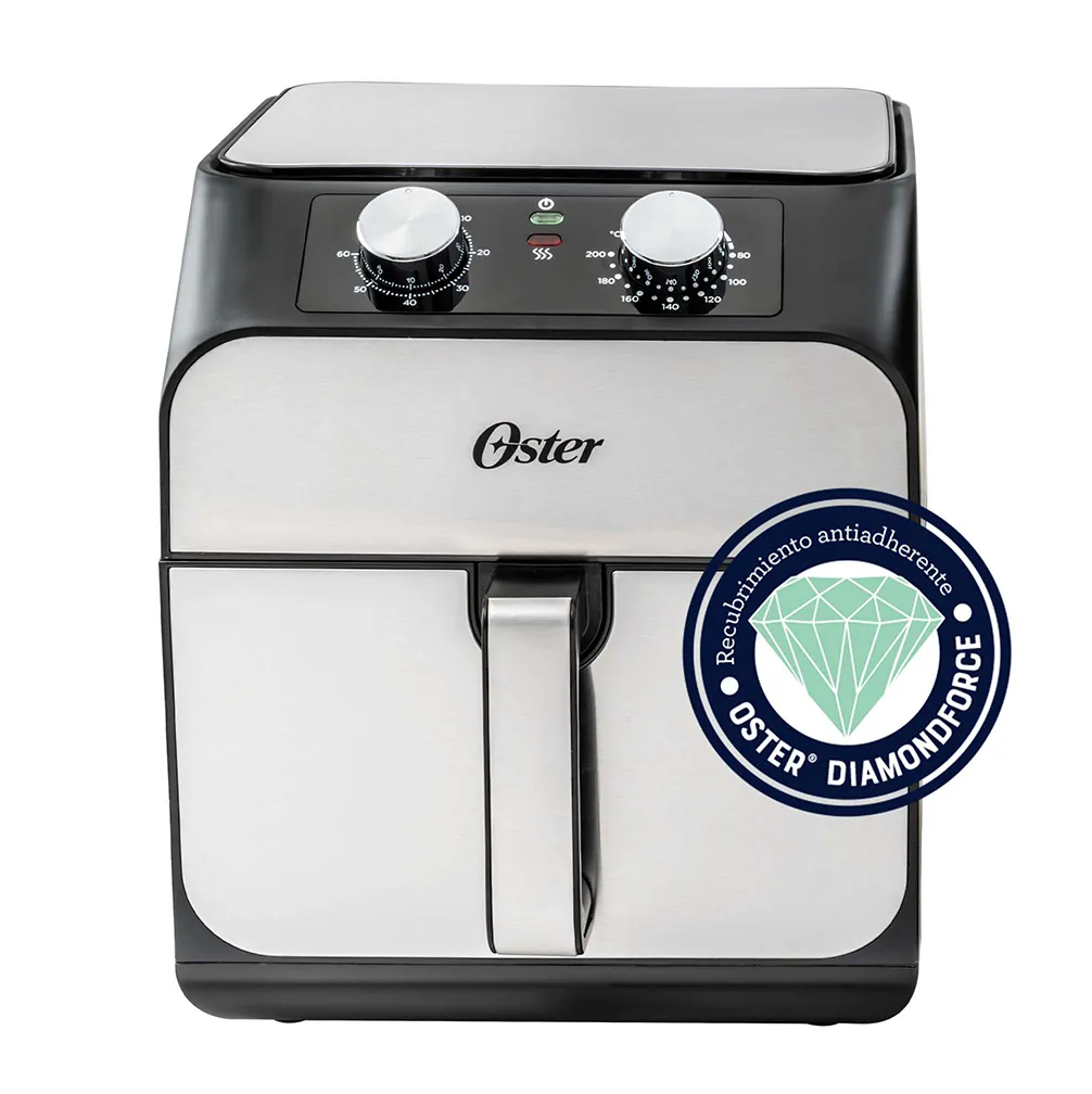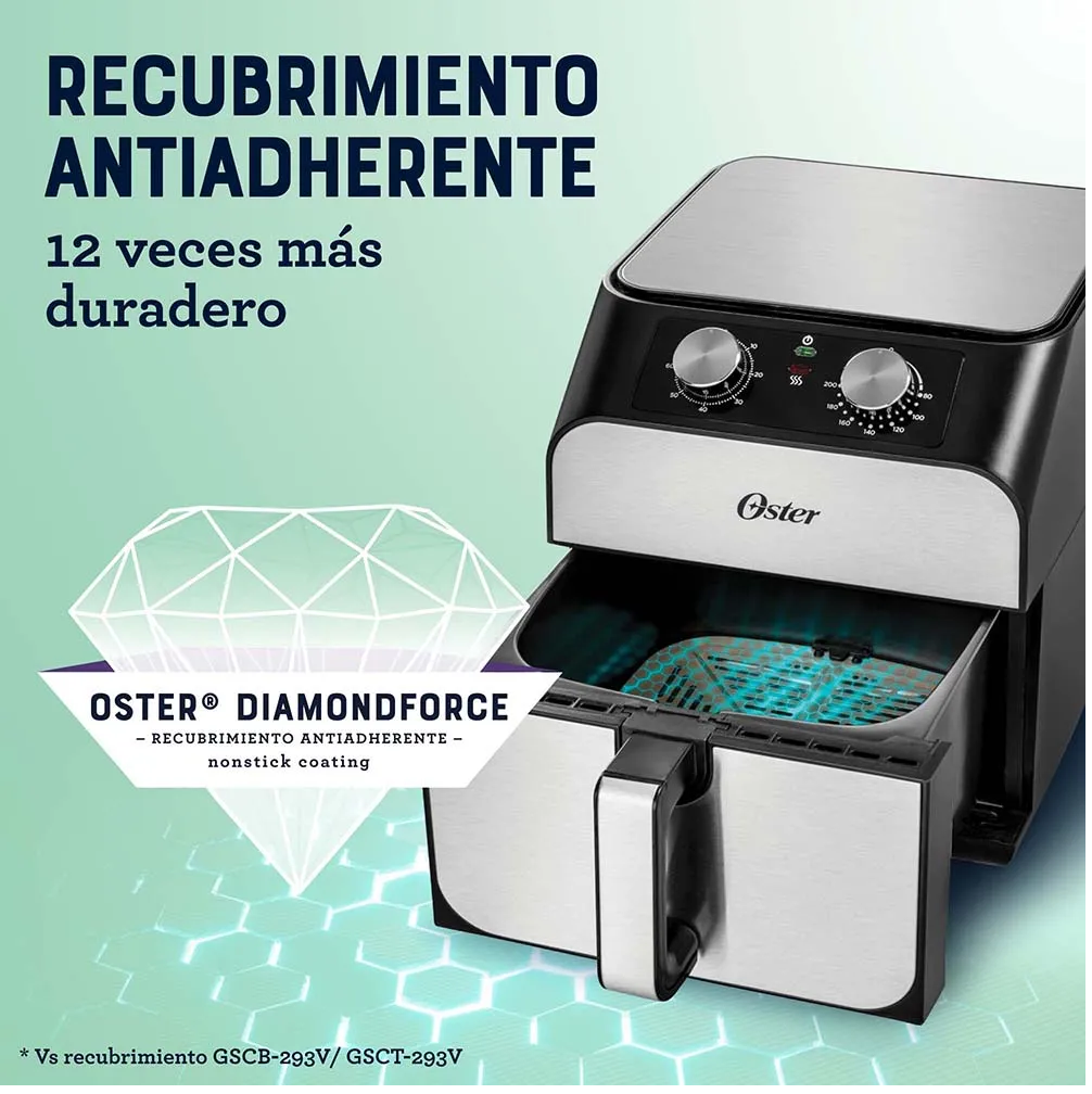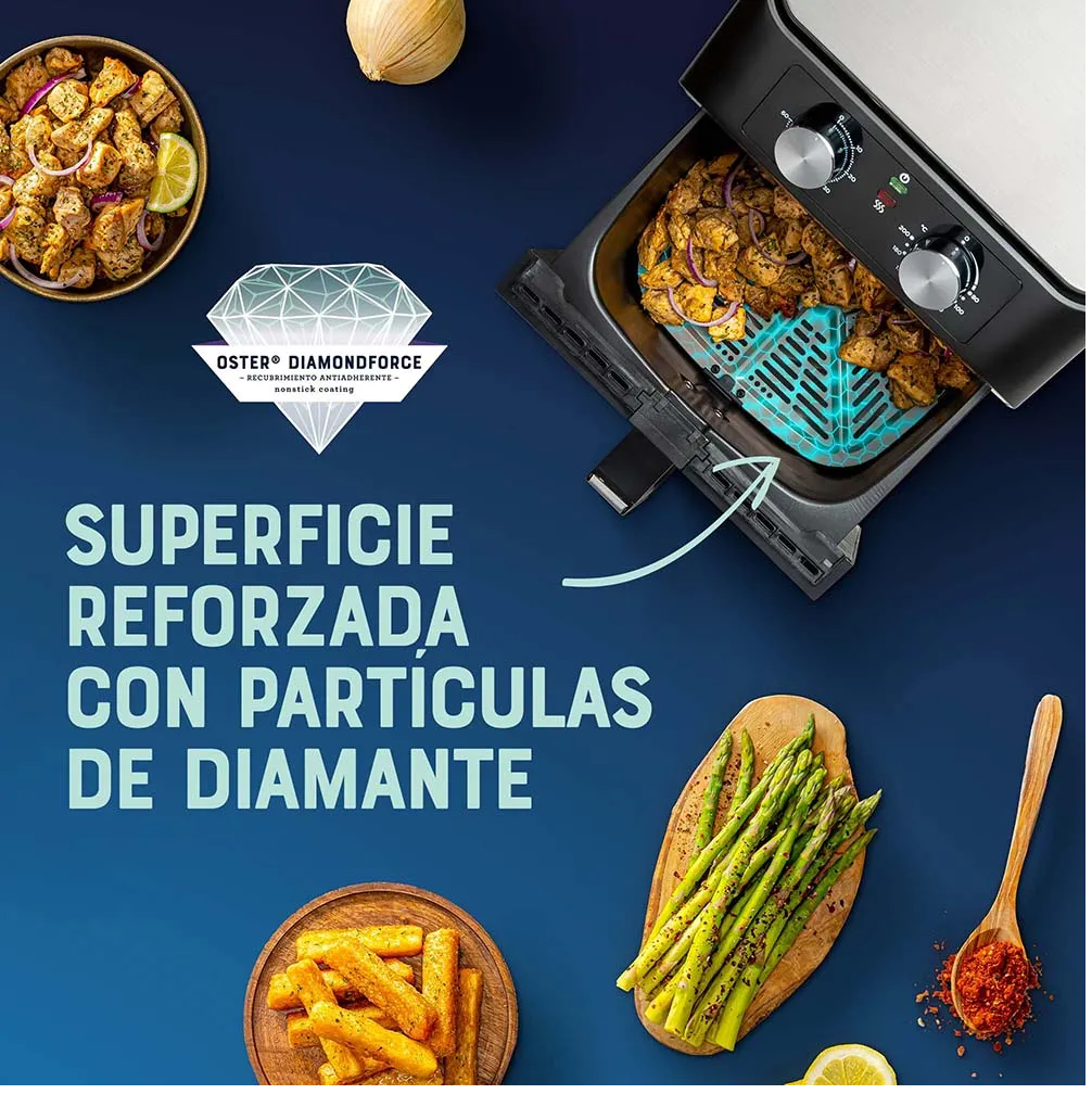 ¡Eleva la preparación de tus alimentos! La freidora de aire Oster® con capacidad de 6,8L ahora incluye una bandeja de freír con aire extraible con revestimiento antiadherente DiamondForce para más espacio y una fácil limpieza. Con 20% mas capacidad*, esta freidora de aire te permite cocinar un pollo entero de hasta 2,5 kgs (5,5 lbs). Nuestro revestimiento DiamondForce está reforzado e infundido con partículas de diamante que forman una matriz estructural, creando un revestimiento 12 veces mas duradero y resistente a rayaduras** y hasta 15 veces mas fácil de limpiar**. Es un recubrimiento fuerte y superior al de cualquier otro de su tipo. Esto ayuda a que los alimentos tengan el sabor que te gusta y la grasa no se quede ni en ellos, ni en la rejilla. Por lo tanto son más sanos, y la rejilla es increiblemente fácil de limpiar. La freidora de aire cuenta con un panel manual con control de temperatura hasta 200 °C (400 °F) y un temporizador de 60 min con alerta sonora de "listo". Freír con aire utiliza hasta un 99,5% menos de aceite*** para comidas saludables y deliciosas.