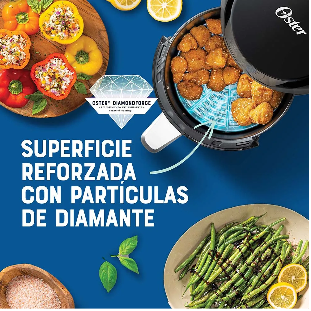 La freidora de aire Oster® digital con recubrimiento DiamondForce tiene una capacidad de 4L y cuenta con un panel digital y 7 funciones preprogramadas, para cocinar pollo, carne, pescado, postres, vegetales, papas fritas y camarones. Incluye una bandeja de freír con aire extraíble con revestimiento antiadherente de Oster® DiamondForce para más espacio y una fácil limpieza. El revestimiento DiamondForce está infundido con partículas de diamante que la hace hasta 12 veces más duradero y resistente a rayaduras* y hasta 15 veces más fácil de limpiar*.