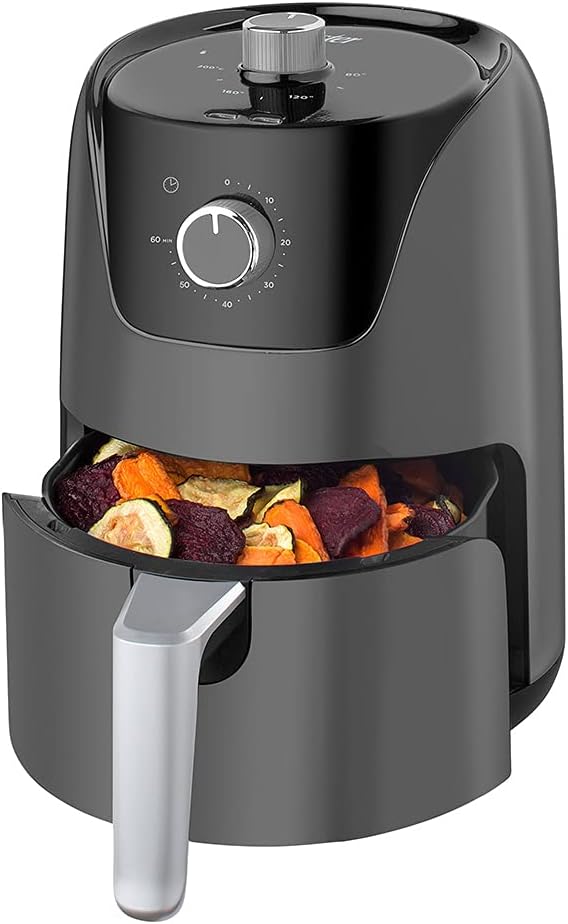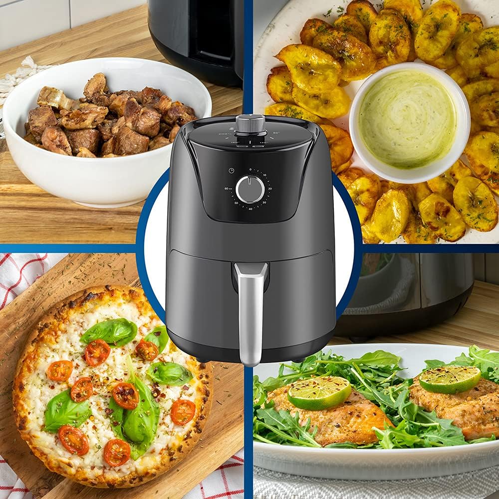 -La freidora de aire cuenta con una perilla de control de temperatura y un temporizador ajustable de hasta 60 minutos, que te permite cocinar una variedad de comidas, como pollo, carnes, vegetales, pescado y postres.