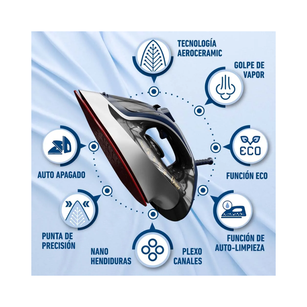 - Suela con tecnología aerocerámica patentada que maximiza a distribución de vapor, ofrece 45% más cobertura* y 40% mejor deslizamiento** en las prendas, maximizando la distribución del vapor.