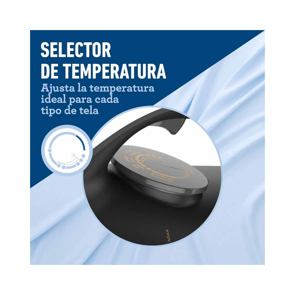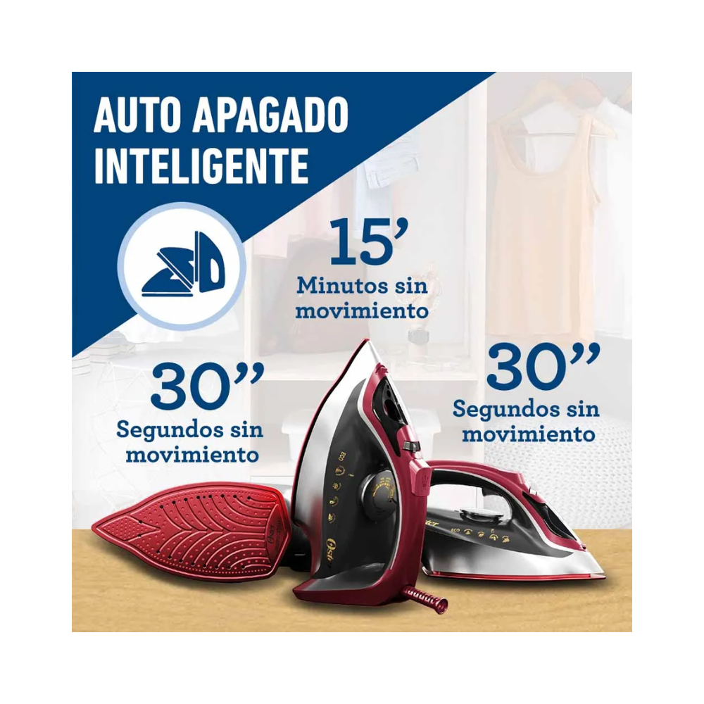 - Apagado automático de 3 posiciones, donde la plancha se apaga automáticamente cuando está sin movimiento 15 minutos parda, 30 segundos apoyada de lado y 30 segundos con la suela sobre la tela