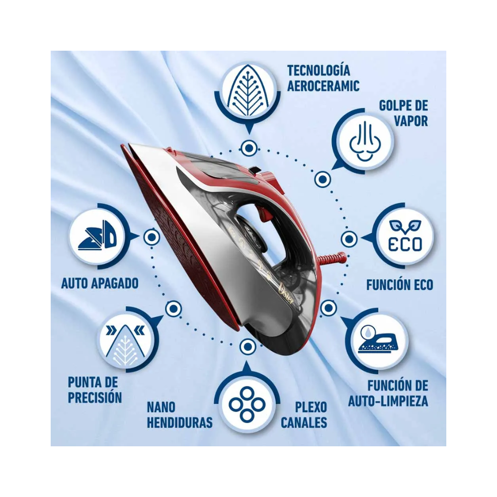 - Suela con tecnología aerocerámica patentada que maximiza a distribución de vapor, ofrece 45% más cobertura* y 40% mejor deslizamiento** en las prendas, maximizando la distribución del vapor.